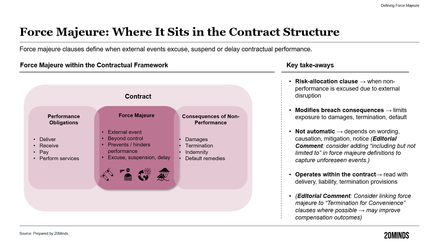 It is important to remember that force majeure is mainly a contractual principle, meaning that the choice of applicable law for the contract is important. For instance, in a contract under English law a specific force majeure clause must be included for any of the parties to be able to invoke force majeure. (Per Hoffman, 20Minds Editorial Advisor)